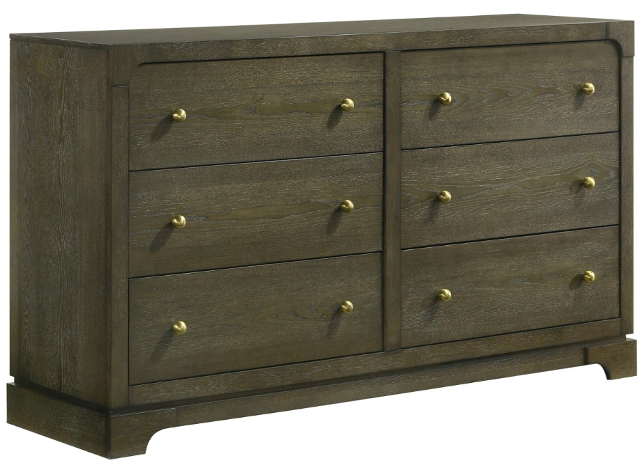 Add a touch of elegance to your bedroom with this spacious dresser, featuring a transitional design with rounded corners and trending details. The dark cocoa finish and brass knobs complement the sophisticated style, while the solid wood drawer box with English dovetail joinery ensures durability.Read More