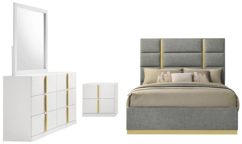 This contemporary bedroom set channels high-end Italian style through sleek geometry and luxe material finishes. Each piece is accented with polished gold details that bring sculptural contrast to clean, modern lines.Read More