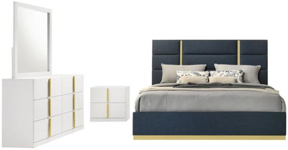 This contemporary bedroom set channels high-end Italian style through sleek geometry and luxe material finishes. Each piece is accented with polished gold details that bring sculptural contrast to clean, modern lines. Case goods wrapped in eco-friendly PET thermoplastic for a glossy, durable, and easy-to-clean surface, while the bed features soft woven upholstery with bold gold acrylic trim.Read More