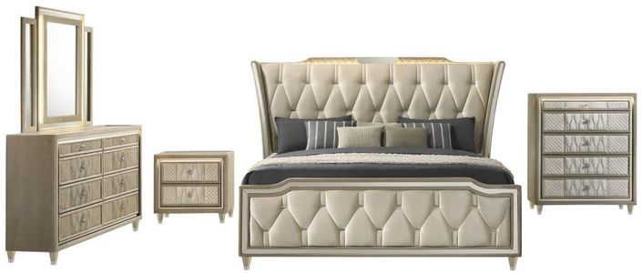 Includes: One (1) queen bed, one (1) nightstand, one (1) dresser, one (1) dresser mirror, and one (1) chest of drawers