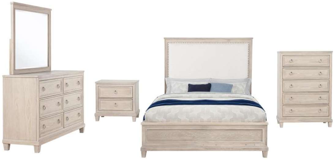 Includes: One (1) California king bed, one nightstand, one dresser, one dresser mirror, and one chest of drawers