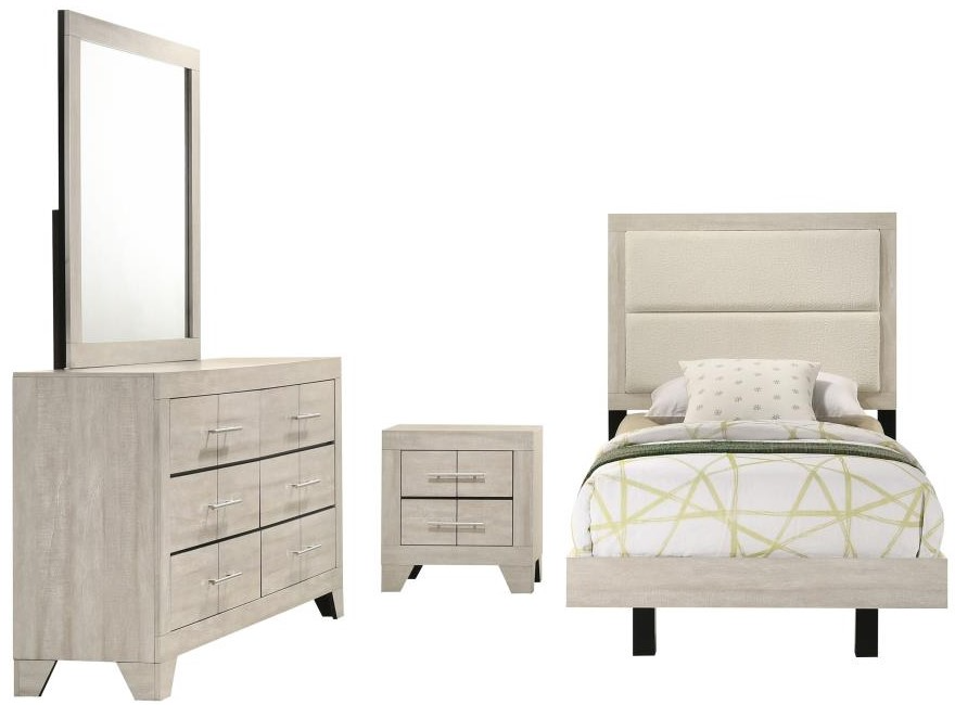 The Coaster® Trenton 4-Piece Rustic Cream Twin Panel Bedroom Set includes a twin bed, dresser, mirror, and nightstand, all featuring a rustic cream finish. This set combines timeless style and ample storage, creating a cozy, elegant, and functional bedroom that complements any décor.Read More