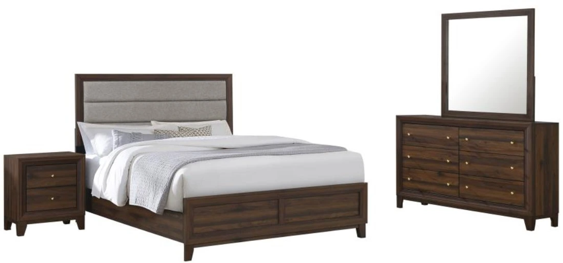 Straightforward style and clean lines highlight a modern four-piece California king bedroom set with an upholstered headboard