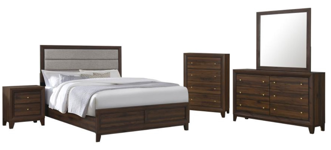 Straightforward style and clean lines highlight a modern five-piece California king bedroom set with an upholstered headboard