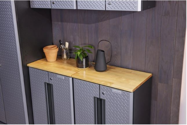 Simply place the 24" Flex Cabinet System Worktop over any 24" 2-Door Base Cabinet or 1-Drawer 2-Door Base Cabinet and turn it into the perfect, durable tabletop workstation for everything from household repairs to woodworking. The solid hardwood top is treated with a UV-cured protective coating to protect the garage cabinet sets.Read More