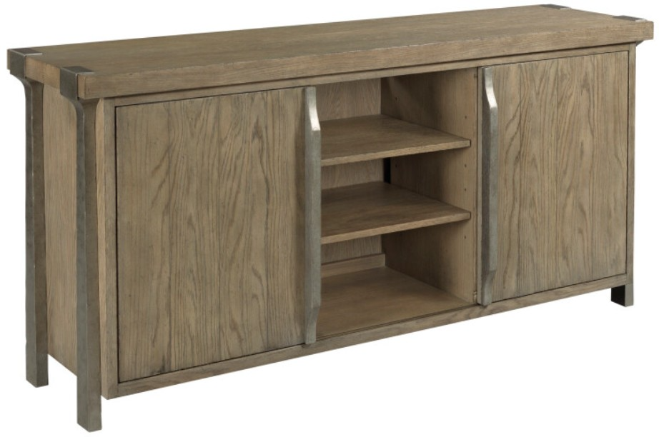 The Timber Forge Entertainment Console has metal legs that are aged natural silver in color. This table has one adjustable shelf behind each sliding door, and two adjustable shelves in the center section, with wire management in the back.Read More