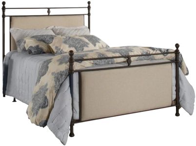 Create a sanctuary in your home with this luxurious queen-size bed, featuring an embellished metal frame in a rustic brown finish and lavish stone-colored upholstery. Adorned with decorative finials on the posts, the matching headboard and footboard bring sophistication to any space.Read More