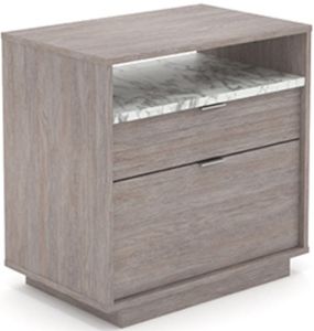The spacious lower drawer holds letter or legal size hanging files to keep your most important documents organized and easy to access. The upper drawer of this legal size filing cabinet features a louvered front and gives another useful area for storing smaller items like office supplies or paper. Both drawers open and close on full extension metal slides. The open area of the lateral file cabinet with shelf adds a faux white marble accent plus additional storage for framed photos or other home décor. Use this shelf and the top surface to display what you wish. For added safety, a patented interlocking mechanism allows only one drawer open at a time. It’s finished on all sides in Ashen Oak™, so this modern 2 drawer filing cabinet will look complete however you configure the room.