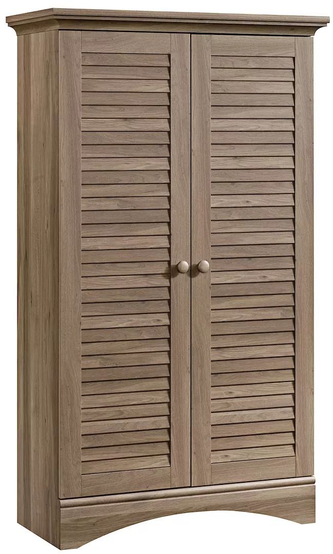 Hide the clutter and chaos with this storage cabinet from the Harbor View collection. Behind the louver doors are four adjustable shelves and a full upper shelf so you can store books, bins, towels and much more. Finished in Salt Oak and detailed with solid wood knobs, this storage cabinet will have your home looking ship shape in no time.