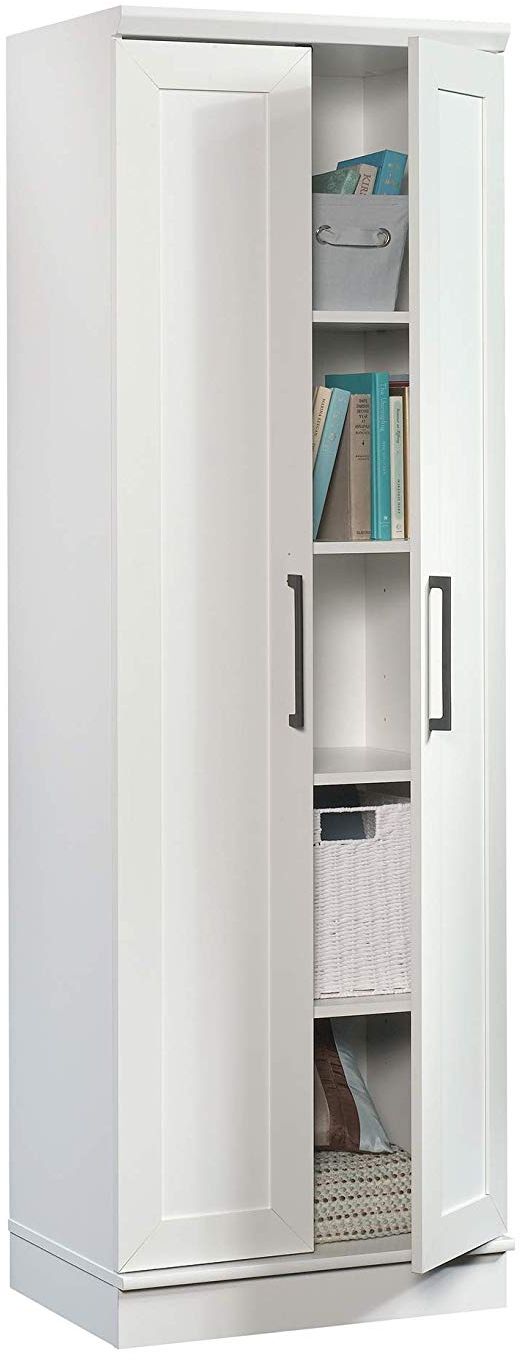 No need to sacrifice style for storage when you can have both with this storage cabinet from the HomePlus collection. Behind its framed panel doors, it features four adjustable shelves so you can stow away all your clutter and mess. Other features include an enclosed back panel with cord access and adjustable base levelers. Finished in Soft White, this sleek cabinet will look good and get you organized in a snap.