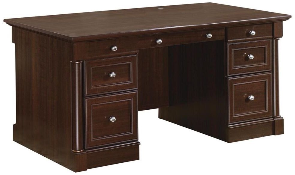 Make a lasting impression in your office with this executive desk from the Palladia collection. Its spacious tabletop surface provides you with room for your laptop, important papers and your coffee mug of course. It features a large drawer/shelf with a flip-down panel for your keyboard/mouse, two pencil drawers, two storage drawers, two file drawers with full extension slides to hold letter, legal, or European size hanging files, and a cord management system. Finished in Select Cherry, this stylish desk will add a sophisticated touch to your office.