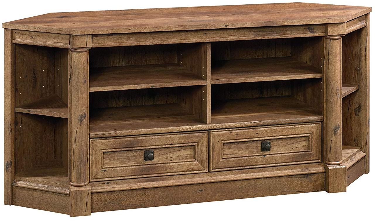 Optimize the space in your living room or entertainment area with this corner entertainment stand from the Palladia collection. Grab the popcorn and cozy up on the couch, this space saving stand accommodates up to a 60” TV making it perfect for all night movies marathons or binge watching that new must-watch show. It features spacious open shelving that includes two adjustable shelves for you to store all your video and gaming equipment. It also features an adjustable corner display shelf on each side so you can showcase your chic home décor. The two easy gliding drawers open and close on smooth metal runners for easy access storage of books, movies, and board games. The enclosed back panel includes cord access to keep your wires neatly organized and out of the way. Finished in a beautiful Vintage Oak and accented with black hardware, this good looking TV stand adds style and functionality to any room in your home.