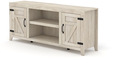 A farmhouse look with modern flare -- this TV credenza from the Sauder Select collection reminds you of simpler times with rustic charm and unique design. This farmhouse TV stand accommodates up to a 70” TV weighing up to 95 lbs., making your living room the perfect place for game nights and watch parties with your friends. This wood TV stand features two country-inspired barn doors that open for additional hidden storage, revealing an adjustable shelf behind each door. This credenza TV stand includes a third adjustable shelf in the center open storage area to accommodate items of various heights—meaning you can customize your storage experience! This TV stand with storage also includes cord management through the enclosed back panel so you can keep all your wires neat and out of sight. Finished in Chalked Chestnut® and detailed with matte black hinges and door handles, this cool toned wood farmhouse TV stand will be the simple but stunning centerpiece of your living room.