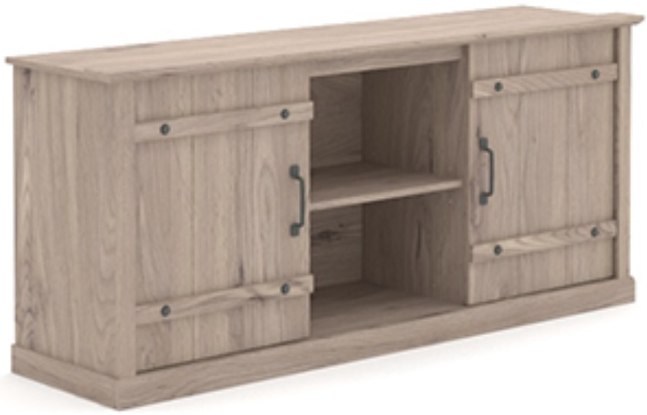 This TV credenza accommodates up to a 70” TV weighing up to 95 lbs., making your living room the perfect place for game nights and watch parties with your family or friends. Three adjustable shelves make this TV stand with sliding doors the perfect place to store items of various heights that are hard to fit most other places. This TV stand with storage also includes cord management through the enclosed back panel so you can keep all your wires tidy and out of sight. Finished in Laurel Oak® and accented with rustic inspired hardware, this credenza TV stand will be the beacon of a bygone era in the center of your living room.