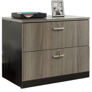 This lateral file cabinet features two drawers with full extension slides that can hold letter, legal, or European size hanging files so you can keep all your papers organized. Filing important papers? No worry. Both drawers include a lock for secure storage. This 2 drawer lateral file cabinet also features a patented, interlocking safety mechanism which allows only one drawer to open at a time for extra safety precautions. This horizontal file cabinet has a melamine top surface that is resistant to heat, stains, and scratches. It also features adjustable floor levelers and a cord management system with a desktop grommet hole. Finished in Hudson Elm with Soft Black accents, this lateral file will have you feeling organized in no time!