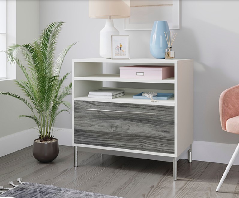 Fill the top surface and open display area of this 1 drawer file cabinet with photos of your family, home décor, a printer, lamp and so much more. This open shelf filing cabinet is finished on all sides for versatile placement in any room of your home—this piece will look polished and complete from any angle! With a Pearl Oak™ finish with Misted Elm™ accent and a metal base and drawer pull, this legal-size filing cabinet is the chic addition you have been looking for.