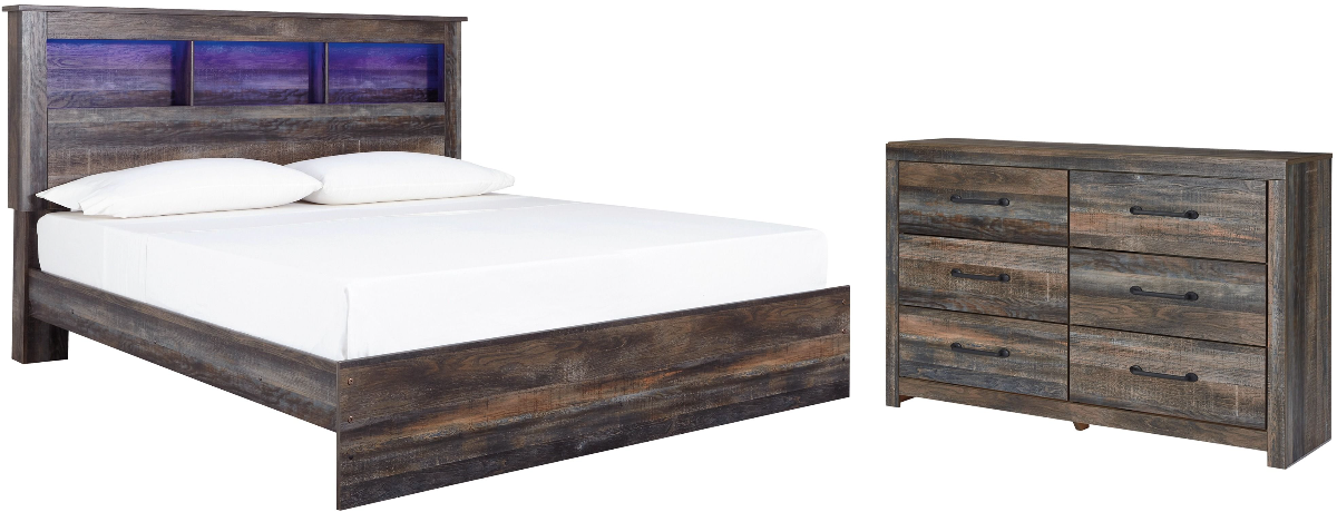 Includes king-size bookcase bed with storage (bookcase headboard, footboard, under bed storage unit, rails and wood roll slats) and 6-drawer dresser