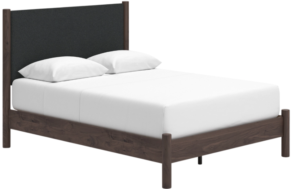 Crafted with both form and function in mind, this queen upholstered panel platform bed brings a dash of retro-cool character to your modern boho aesthetic. Its textured black headboard fabric adds a trend-right touch to the classic silhouette. Warmly welcoming with a rich brown finish.Read More