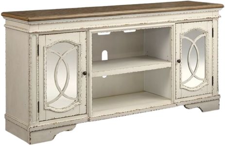 Elevating the art of traditional cottage styling, this TV stand with fireplace option is beautifully in tune with your taste. Antiqued two-tone aesthetic blends a chipped white with a distressed wood tone top for added charm. Cabinet doors’ decorative fretwork over mirrored glass adds a lovely twist. This model is being sold As-Is with minor cosmetic shipping damage.Read More