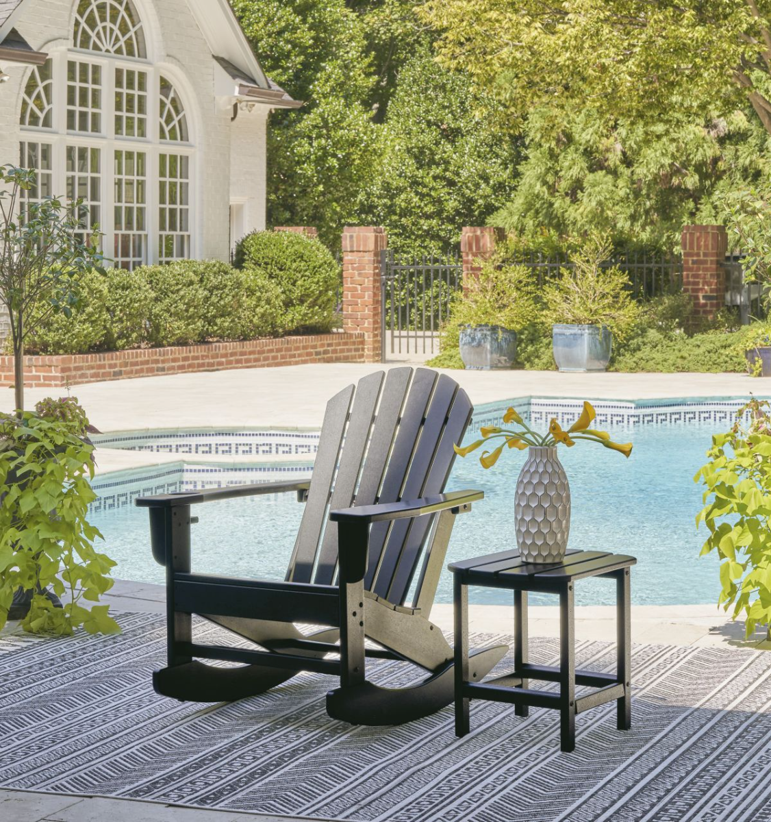 Add cottage-quaint charm to your outdoor oasis with this rocking chair in black. Made of MEGA-TUFF® high-density polyethylene material, it’s sure to weather the seasons beautifully. Designed to shed rainwater, the chair’s slatted styling and classic Adirondack design provide exceptional form and function.Read More