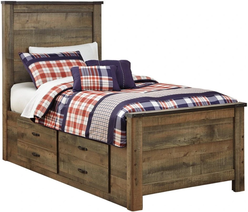 Whether she loves horses or he's a cowboy at heart, this twin panel bed with under bed storage matches their authenticity. Its rustic finish, plank-style details and nailhead trim pay homage to reclaimed barn wood, making for a chic look loaded with charm. Mattress available, sold separately.Read More