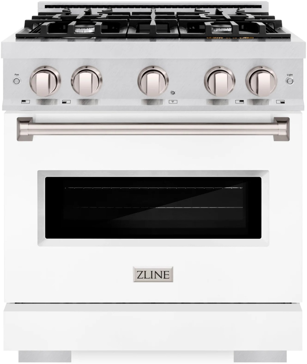 The ZLINE 30 in. 4.2 cu. ft. Classic Dual Fuel Range with 4 Burner Gas Cooktop and Electric Convection Oven in Satin Stainless Steel with White Matte Door (CDRS-WM-30) combines the elegance of a hand-finished porcelain gas cooktop with 4 Italian-made auto-reignition burners, an electric convection oven with an energy-efficient cooling fan to ensure quiet operation, and a beautiful white matte door with a Landscape window design allowing you to master every meal.