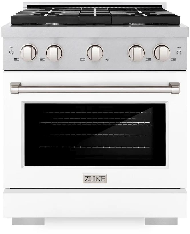 The ZLINE 30 in. 4.2 cu. ft. Paramount Dual Fuel Range with 4 Burner Gas Cooktop and Electric Convection Oven in Satin Stainless Steel with White Matte Door (SDRS-WM-30) combines the versatility of a gas cooktop with 4 Italian-made auto-reignition burners, an electric convection oven with digital thermostat technology, enhanced cast iron grates, and a beautiful white matte door with a Horizon window design allowing you to master every meal.